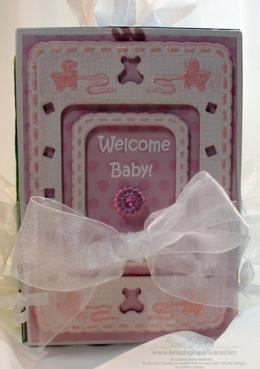 For each of the frames I used Whitewash Coredinations and after embossing, buffed the raised areas with file paper so that the darker color would show.  For each of the open stencil areas I used glitter.  Two frames come with this set so I opted to use the smaller frame inside the larger frame to bring down the openness and make the frame a little more cozy.  Inside each  I stamped the words Welcome Baby which is from an Our Daily Bread Designs set that came out this month – Noahs Ark!  On the top of the box I used Spellbinders™ S4-247 Labels Twelve and embellished with Spellbinders™ Fancy Tags.